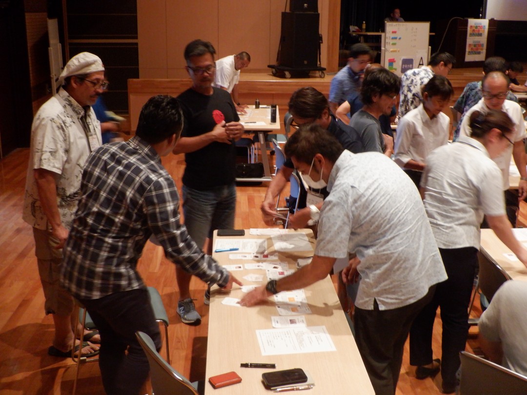 「SDGs de 地方創生 ともに考える、持続可能な恩納村の未来」(NPO法人イシュープラスデザイン主催)が10月14日、ふれあい体験学習センターで行われました。民間企業や関係団体等から約70名が参加し、講演とシュミレーションカードゲームをとおしてSDGsと地方創生について学びました。