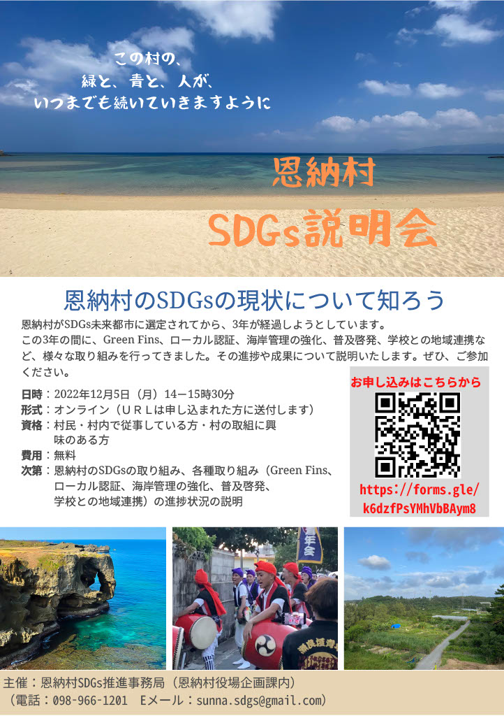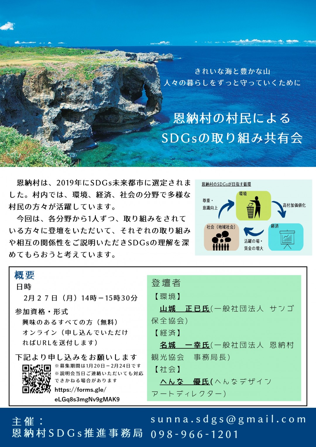 恩納村は、2019年にSDGs未来都市に選定されました。村内では、環境、経済、社会の分野で多様な村民の方々が活躍しています。今回は、各分野から1人ずつ、取り組みをされている方々に登壇をいただいて、それぞれの取り組みや相互の関係性をご説明いただきSDGsの理解を深めてもらおうと考えています。ぜひご参加ください!