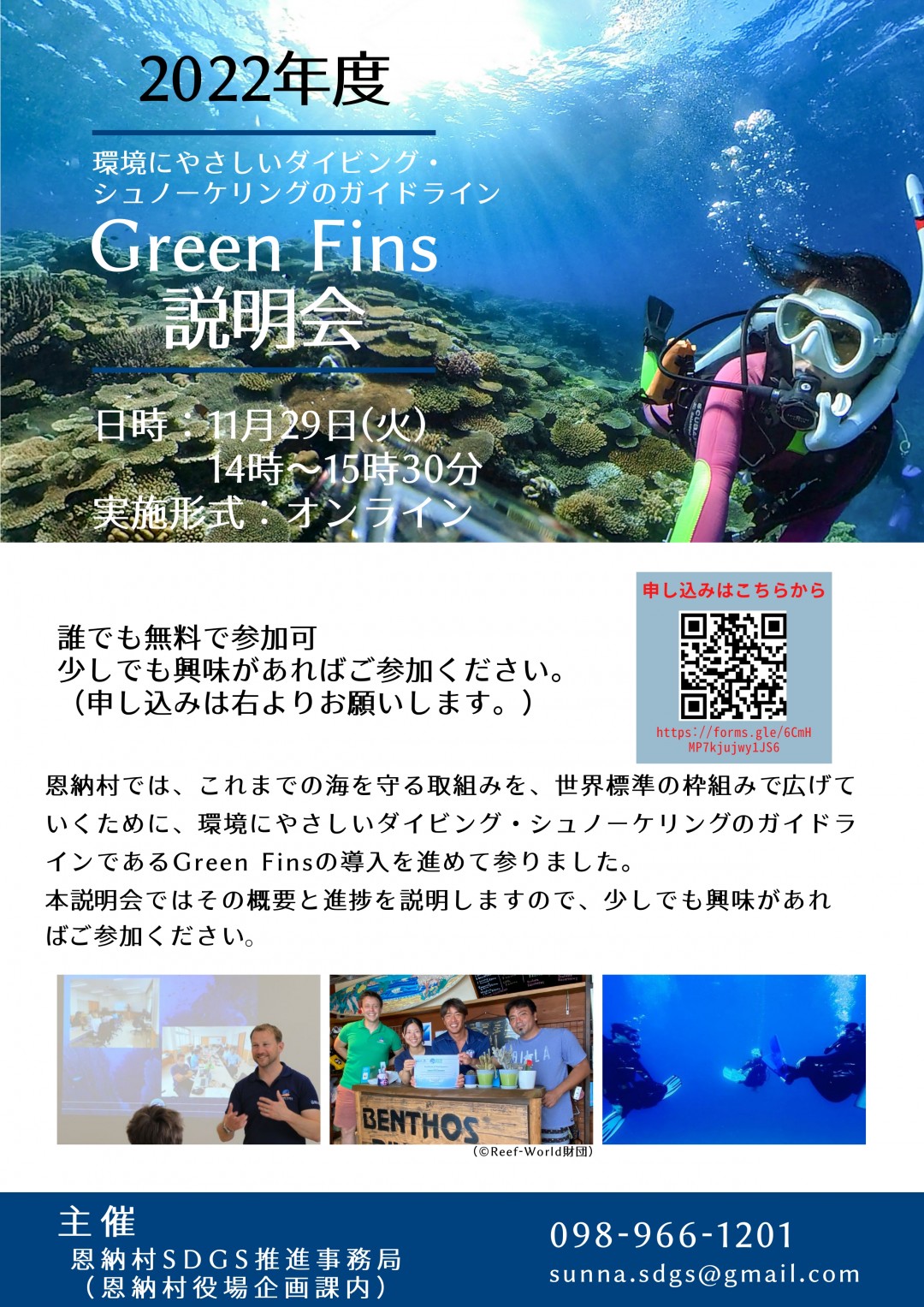 恩納村では、これまでの海を守る取組みを、世界標準の枠組みで広げていくために、環境にやさしいダイビング・シュノーケリングのガイドラインであるGreen Finsの導入を進めて参りました。本説明会ではその概要と進捗を説明しますので、少しでも興味があればご参加ください。