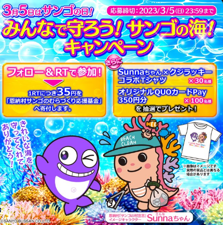 このキャンペーンは3月5日の「サンゴの日」にちなみ、SANYOのTwitterリツイート1件につき35円を『恩納村サンゴの村づくり応援基金』へ寄付する取組みです。