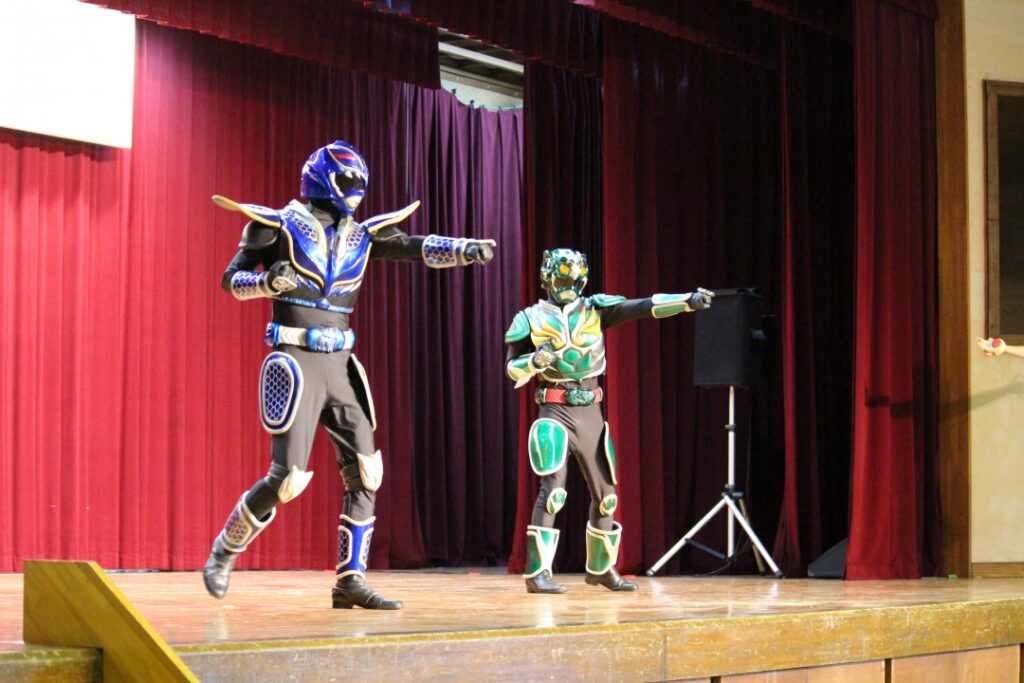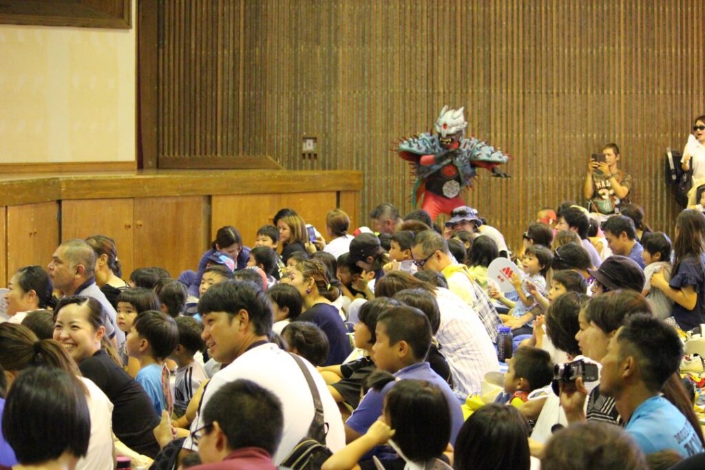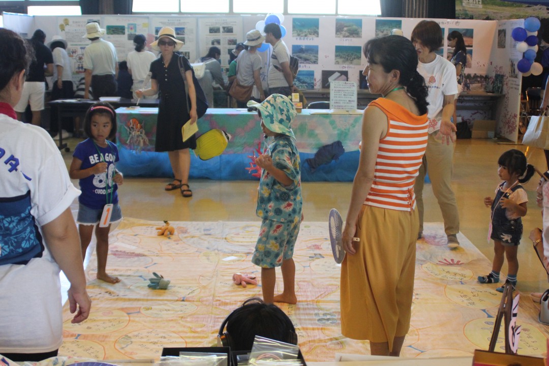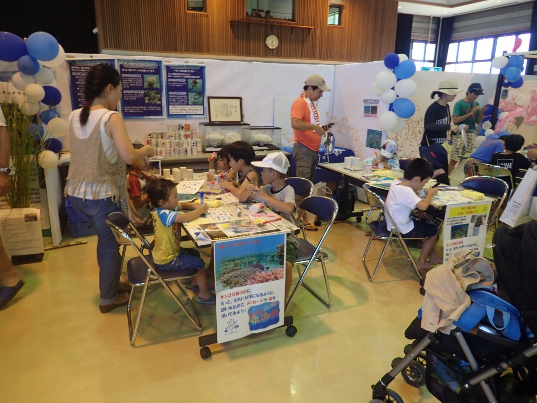 家族連れなど約1,400人が琉神マブヤー普及啓発ショーやクイズ、サンゴを養殖する基盤に絵を描くワークショップなどに参加しました。